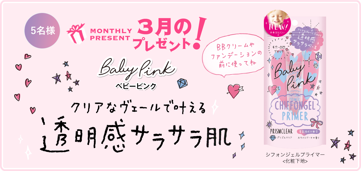 2018/03/12 apricot-manager ■ 応募サイト:バイソン ■ 締切日:2018年03月26日 ■ 抽選で5名様 ベビーピンク「シフォンジェルプライマー」を抽選で5名様にプレゼントいたします。 当選者の発表はプレゼントの発送をもってかえさせていただきます。 応募はこちらから