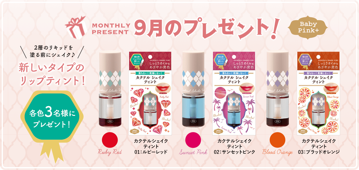 ベビーピンクプラス「カクテルシェイクティント」を抽選で9名様にプレゼントいたします。
