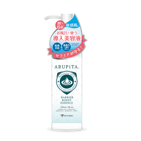 「アルピタ バリアブーストエッセンス」は、入浴直後の乾燥を予防し、次に使う化粧水が浸透しやすい肌へと導くお風呂で使う導入美容液です。