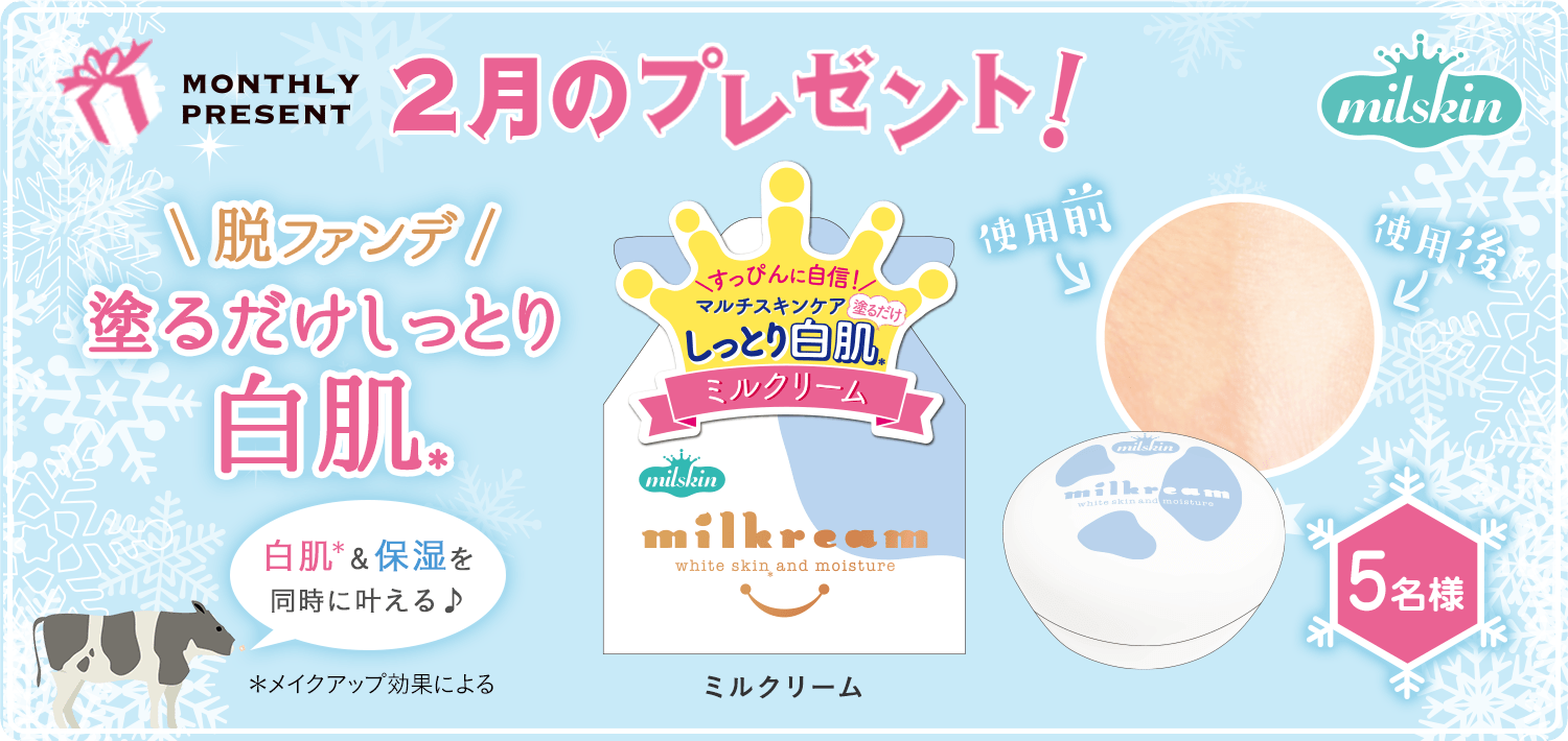 2019/02/06 apricot-manager ■ 応募サイト:バイソン ■ 締切日:2019月年02月26日 ■ 抽選で5名様 ミルスキン「ミルクリーム」を抽選で5名様にプレゼントいたします。 応募はこちらから