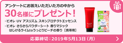 2019/04/17 apricot-manager ■ 応募サイト:花王 ■ 締切日:2019年05月13日 ■ 抽選で30名様 ビオレ さらさらパウダーシート などを抽選で30名様にプレゼントいたします。 ◇プレゼント品の発送をもって、発表にかえさせていただきます。 応募はこちらから