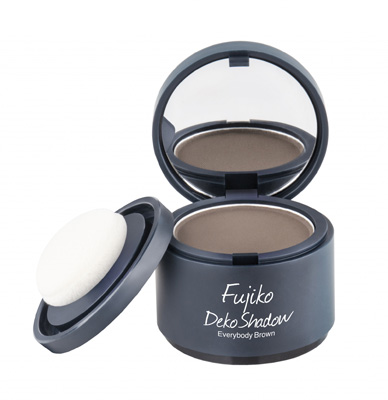 「フジコdekoシャドウ」は、おでこの隙間や生え際・もみあげラインにパフで塗るだけで簡単キレイに小顔に仕上げる新商品。驚くほどになじむカラー・Everybody Brownで卵型に影を作るように描けば、肌色感が減りキュッと小顔に。