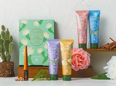 特殊一体型容器を採用し、ハンドクリームとリップクリームが1本に。ハンドクリームは、うるおい成分(ヒアシンスエキス・ルリジサエキス・カミツレ花/葉エキス・ラベンダー花水・アロエベラ葉エキス)配合